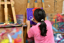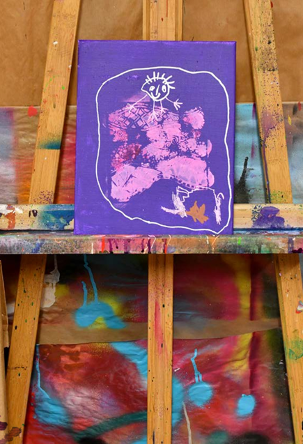 Am grossen Tisch ist Valentina eifrig damit beschäftigt, mit Schablone und Farbstempel rosarote Farbe auf ihre violett grun dierte Leinwand aufzutragen. Sie ist das ältere von zwei Geschwistern aus der Kinderwohngruppe Basilisk und quasi eine Stammkundin im Atelier, da sie fast jeden Mittwoch hier ist. Entsprechend selbstbewusst zeigt sie sich. Fehler mache sie keine, meint sie bestimmt und gibt deutlich zu ver stehen, dass sie kompetent und eigen ständig ist. Währenddessen ist ihre Schwester Luisa* noch mit dem Zvieri beschäftigt und wartet darauf, dass ihre Leinwand trocknet. Nach etwas Nachhelfen mit dem Föhn kann auch sie weiterarbeiten. Gruppe nehmen werden. Beide Mäd chen wollen ihre Werke der Mutter schenken – «oder vielleicht auch dem Vater», meint Valentina. Sie geniessen es, jeweils am Mittwochnachmittag hier sein zu können und mit einem konkreten Produkt das Atelier zu verlassen, das sie verschenken dürfen. Und dass Catherine sich Zeit für sie nimmt, sie ernst nimmt und auf sie eingeht, trägt vermutlich auch dazu bei, dass sie gerne hier sind.